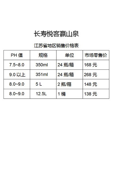 長壽悅客贏山泉 江蘇省地區銷售價格表